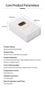 Product Name: Flapper Cover Cardboard Perfume Gift Box Product Size: 180*120*57mm,customized size available Product Material: Eco-Friendly Specialty Paper + High-Strength Cardboard + Flannel + EVA Liner + Magnetic Switch Core Craftsmanship: Partial Embossed Hot Stamping + High-Precision UV Printing Cooperation Terms: MOQ: 3000 units Sample Lead Time: 5-7working days Mass Production Lead Time 20 working days